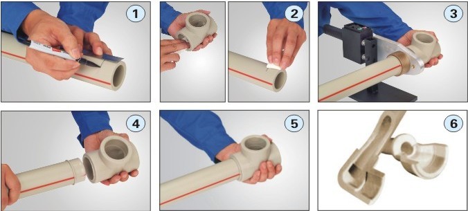 4、達到加熱時間后,立即把管材與管件同時取下,迅速無旋轉(zhuǎn)地直線均勻插入到所標(biāo)記的深度,使接頭處形成均勻凸緣。