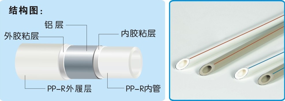 PP-R塑鋁穩(wěn)態(tài)復(fù)合管道是按照CJ/T210-2005(管材)和GB/T18742.3-2002(管件)生產(chǎn)的新型高性能輸水管道,符合GB/T117219衛(wèi)生標(biāo)準(zhǔn)及國(guó)家衛(wèi)生部相關(guān)的衛(wèi)生安全評(píng)價(jià)規(guī)定。管材由PP-R內(nèi)管、內(nèi)膠粘層、鋁層、外膠粘層以及PP-R外覆層組成。