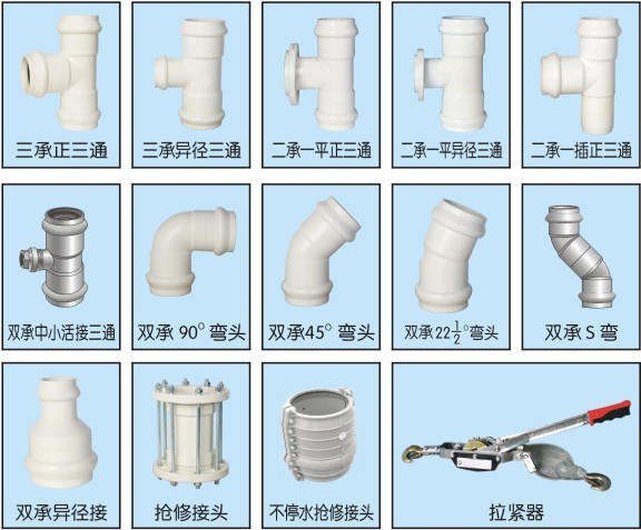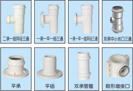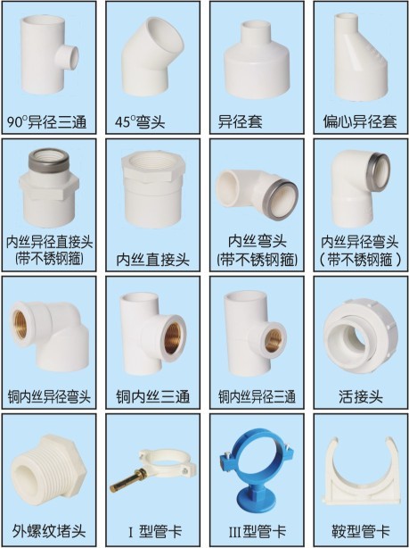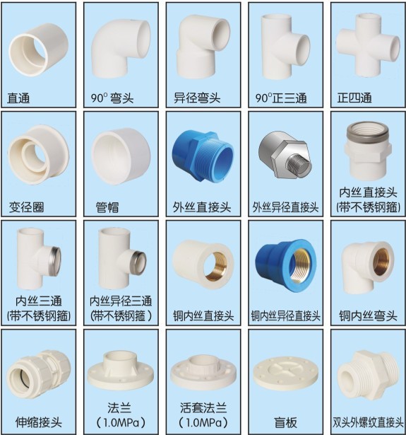 管件系列分為:注塑粘接管件;柔性接口管件;鋼塑柔性接口管件三種系列產(chǎn)品。管件顏色為藍色和白色兩種。