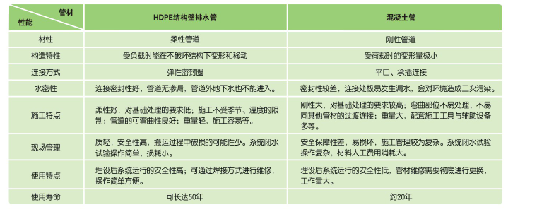 HDPE結(jié)構(gòu)壁排水管與混凝土管的性能比較表