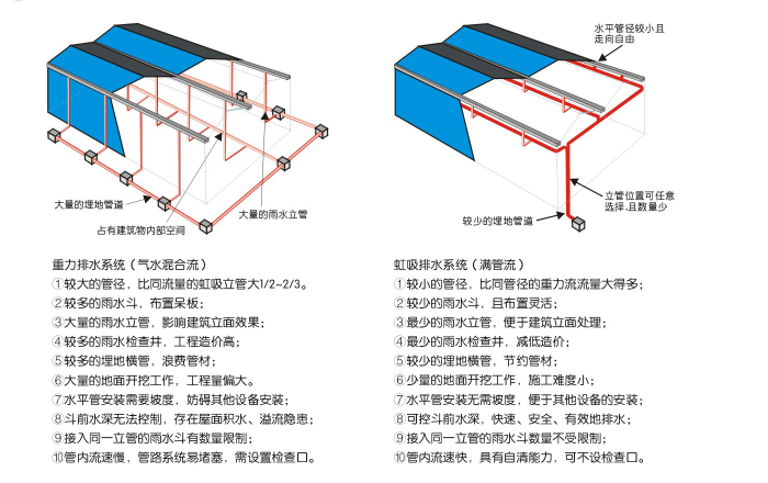 2、管道排水可實(shí)現(xiàn)滿(mǎn)管流,排水暢通,節(jié)省雨水斗、立管、橫管和雨水檢查井等;節(jié)約建筑空間,使建筑外形美觀。